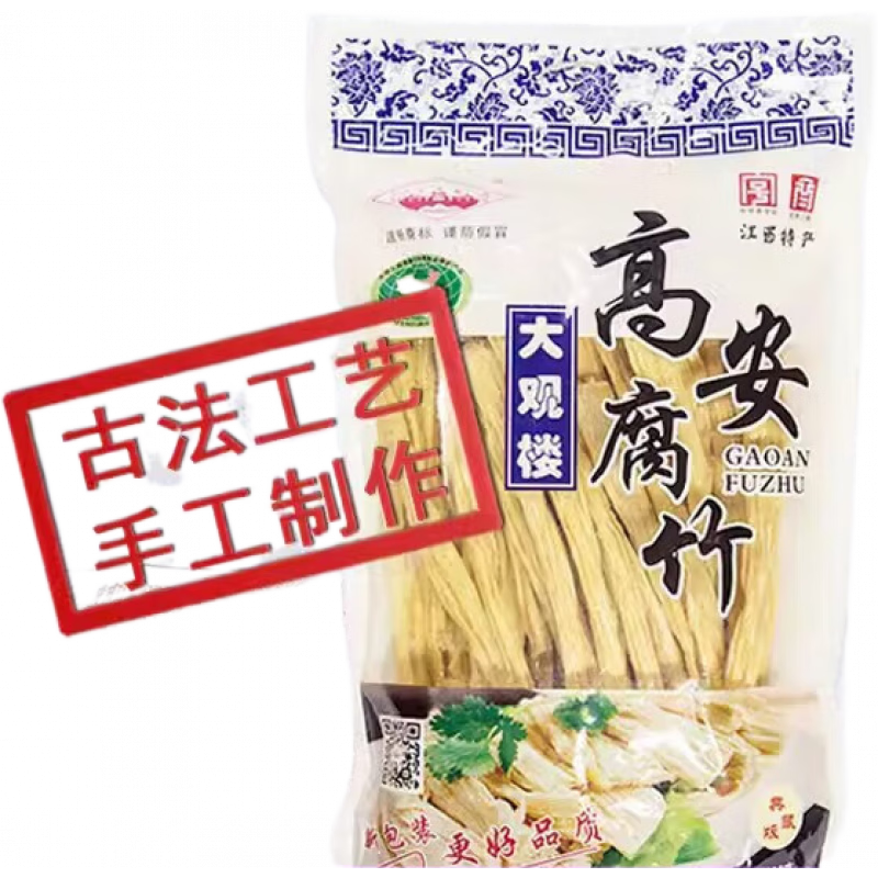 高安市大觀樓腐竹銷售有限公司,是江西省著名商標、江西省市場優(yōu)勝產(chǎn)品,獲得國家銀質(zhì)獎、首屆中國食品博覽會金獎。大觀樓腐竹距今已有1000多年的歷史,以優(yōu)質(zhì)非轉(zhuǎn)基因黃豆為原料,受制于特定水源和自然生態(tài)環(huán)境,是世代傳承的精致工藝與先進的現(xiàn)代科技相融合精制而成的一種高檔豆制品,是國家地理標志保護產(chǎn)品。